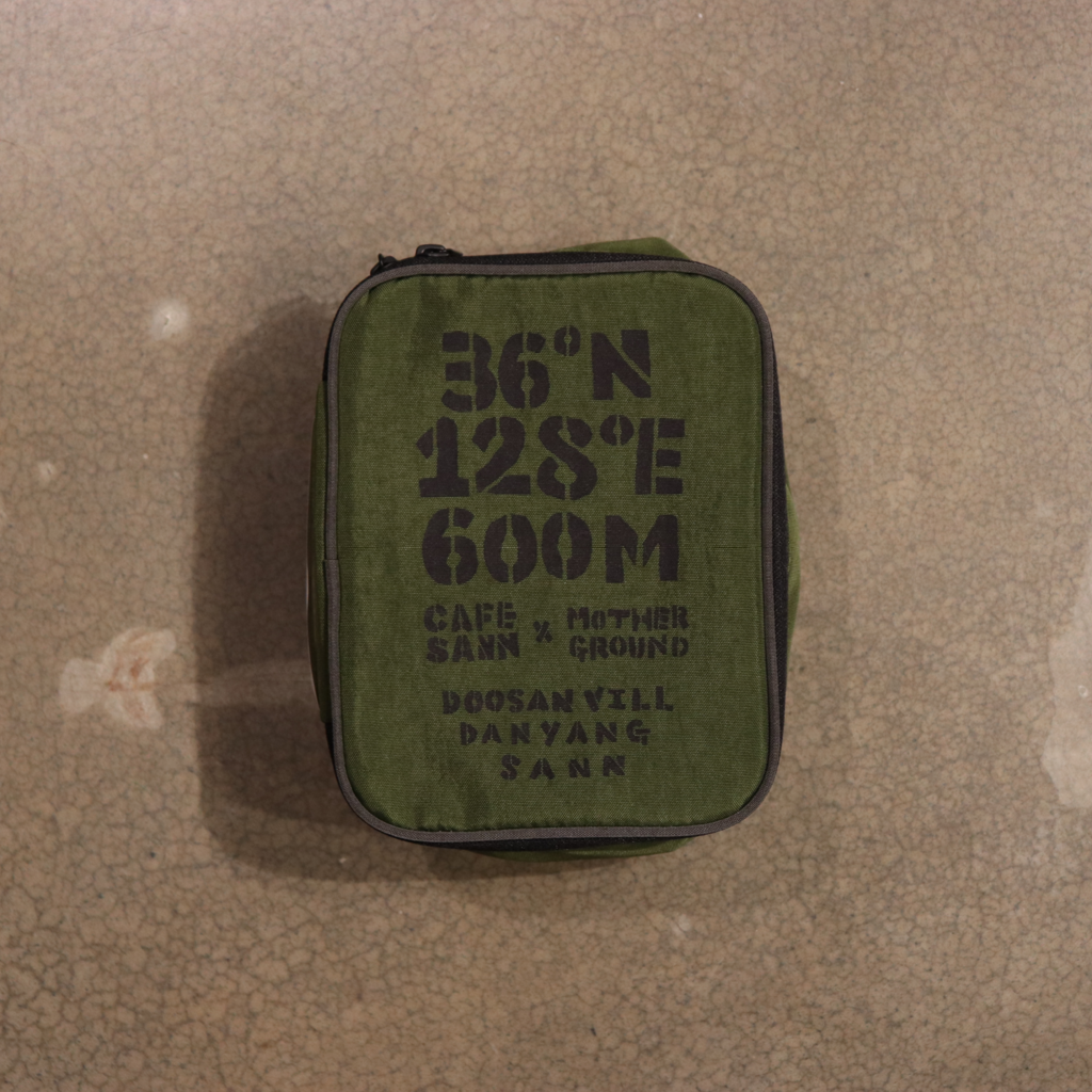지구별 여행자들이 카페산을 찾아올 수 있도록 만든 카피라이트인 위도 & 경도 & 해발고도가 상단에 드로잉되어있고, 지퍼퓰러는 블랙 색감을 사용했습니다.