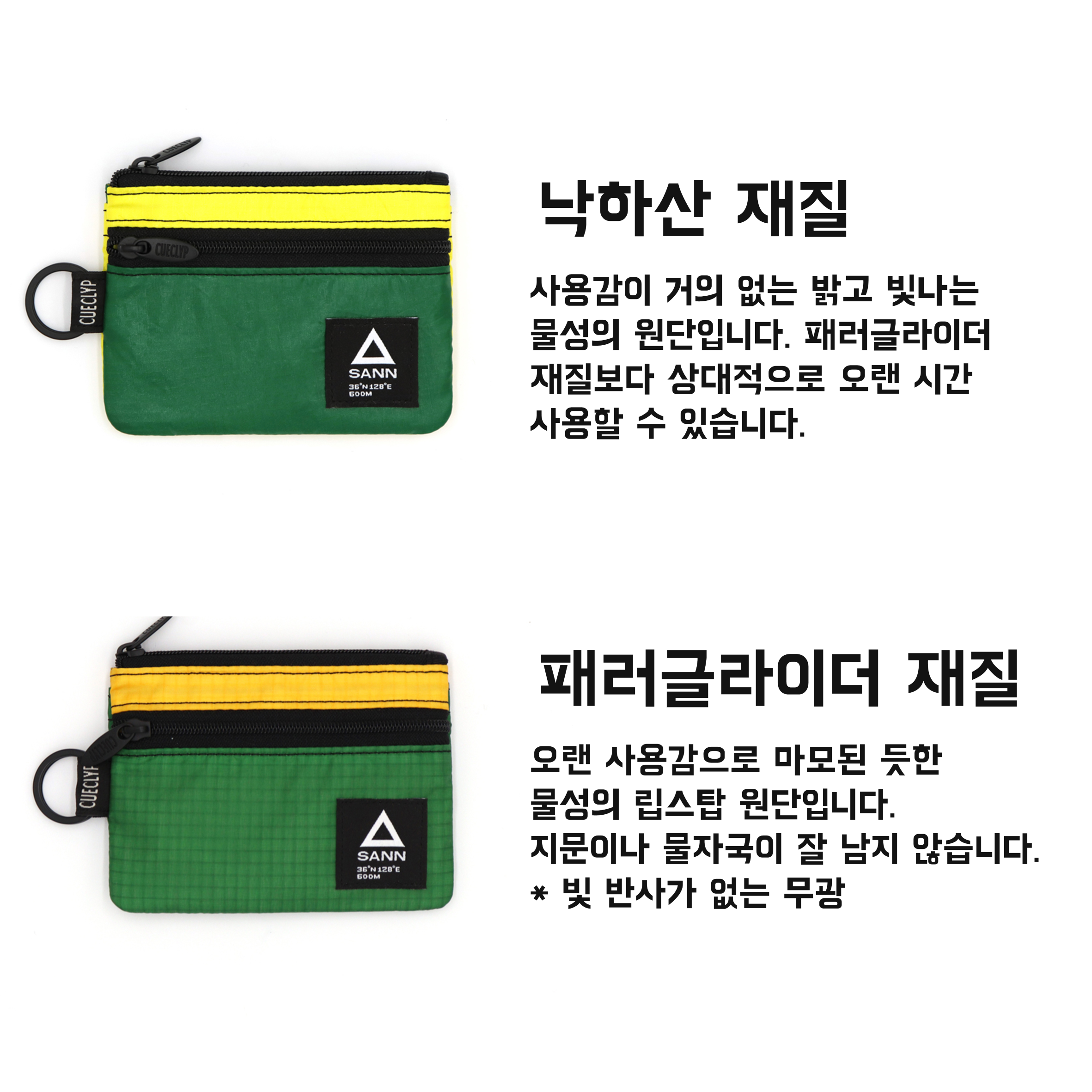 패러글라이더가 돌풍을 만나 안정적인 비행이 어려운 긴급 상황에서 안전하게 파일럿과 탑승객을 보호하기 위해 장비에 내장된 "낙하산"으로 제작한 지갑입니다. 낙하산은 하네스(하늘에서 앉아 비행할 수 있는 시트) 안에 작은 부피로 적재할 수 있도록 최소부피와 중량으로 설계되며, 하강 속도를 적게 유지할 수 있도록 사각형 날개를 갖고 있는 것이 특징입니다.